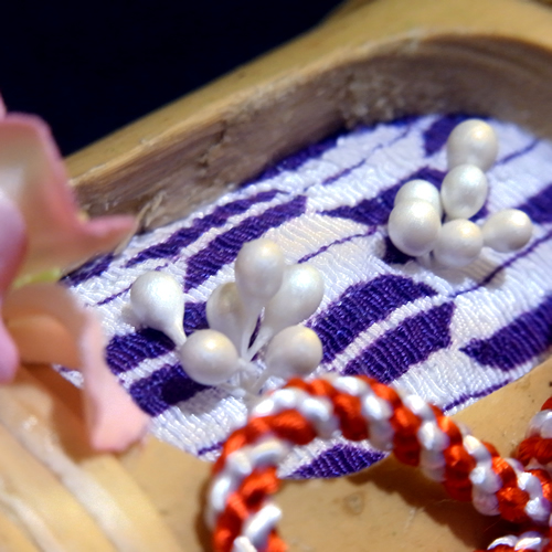 ほんのり花柄が見える横は上品な色合いの組みひもが寄り添います。